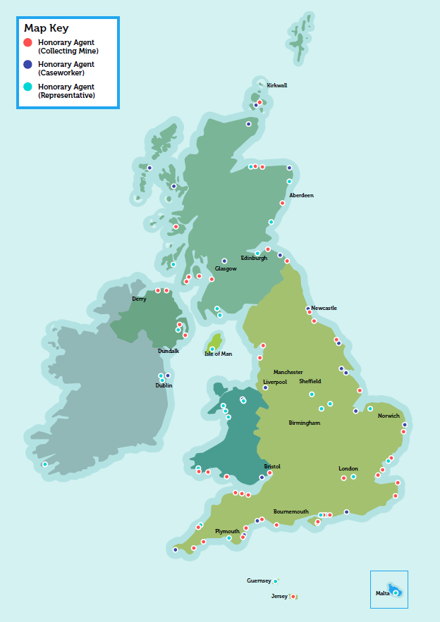 The Shipwrecked Mariners’ Society helps people from all over the British Isles from its main headquarters in Chichester, West Sussex, and through a national volunteer network of over 100 Honorary Agents. It should be noted that many of the Honorary Agents shown on this map provide caseworking support across wide geographical areas of the UK (rather than simply at the location shown). We also receive significant support from SSAFA caseworkers, who provide caseworking services across all regions of the UK. The Society also has an Honorary Agent and a few beneficiaries in Malta.